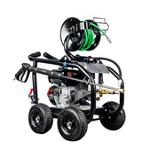4GPM @ 4200 PSI Standard Features: Honda GX390 Gas Engine Belt Driven Triplex Ceramic Plunger Pump 4-Wheel Heavy Duty Steel Cart Design with Wheel Locking Brake System All Units are Completely Factory Assembled in The USA and Delivered Ready to Operate. INCLUDES: Hose Reel W/300’x 3/8” Jetter Hose Selective Hydro – Pulse (Pulsation On Demand) Easy Start Valve – No Load Starting 3 – Jetter Nozzles 50′ Pressure Washing Hose Pressure Washer Wand and Accessories